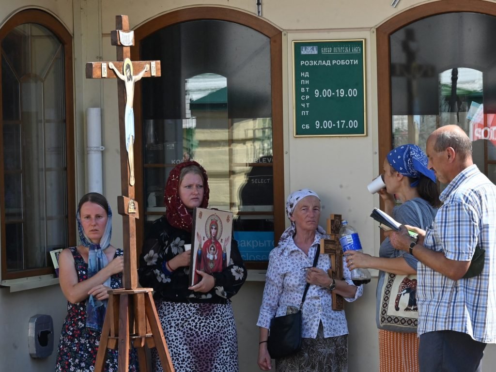 وفي كييف، كان المؤمنون يصلون خارج دير كييف بيشيرسك لافرا التاريخي، القاعدة السابقة لشركة UOC، والتي داهمتها السلطات في عام 2022.