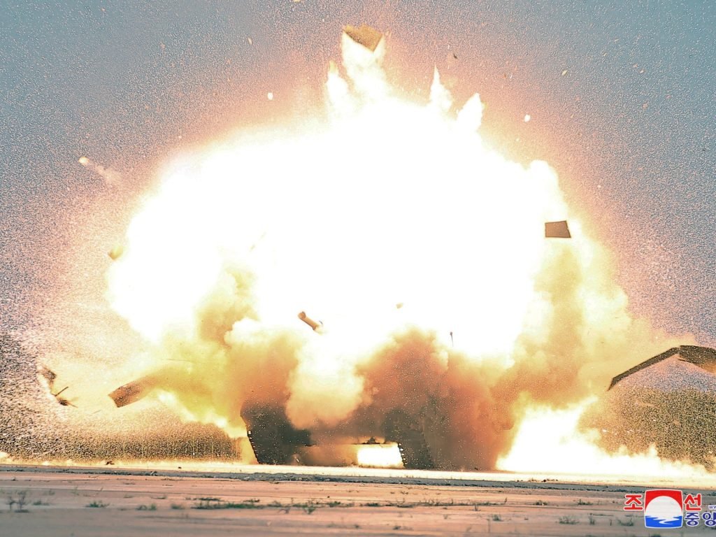 وتظهر وسائل الإعلام الرسمية أن كيم يبدو منتشيًا بعد اختبار اصطدمت فيه طائرات بدون طيار بما بدا أنها دبابة.